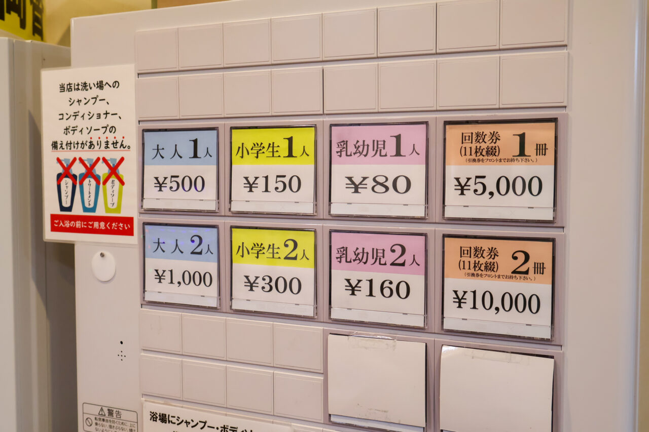 入浴料は大人500円、小学生150円、乳幼児80円の銭湯料金。