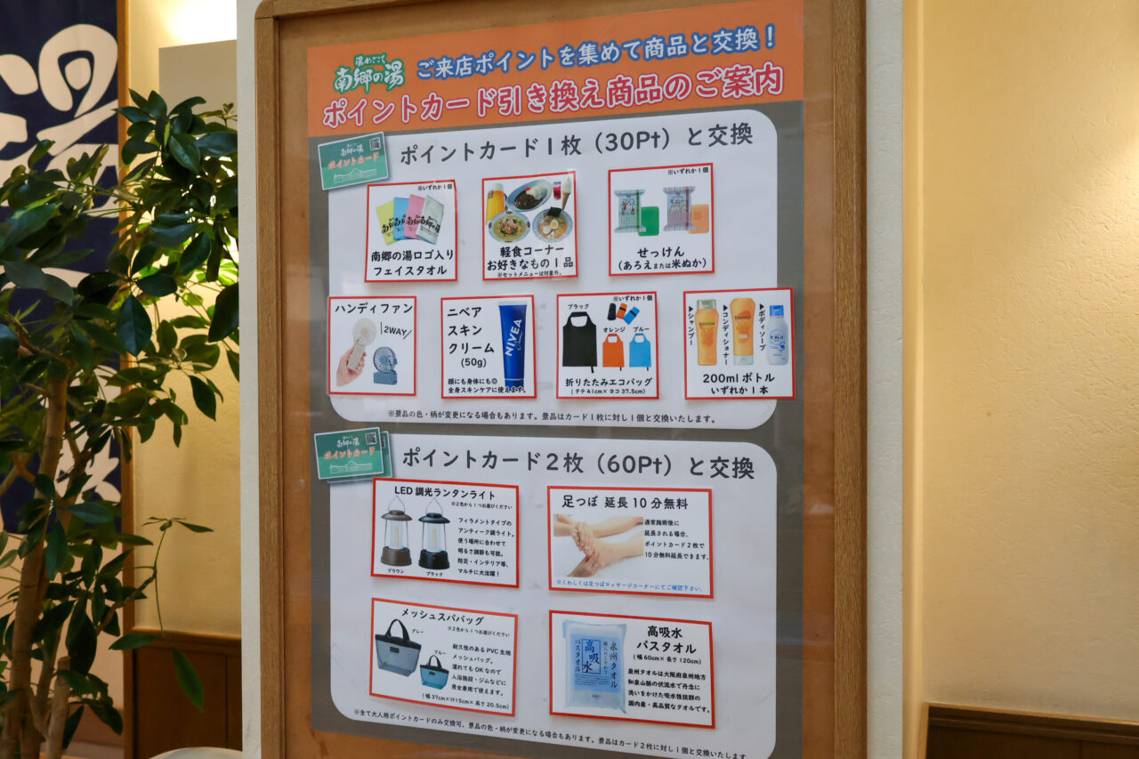 バス用品や雑貨のほか、軽食コーナーのメニューと交換もできるので、たびたび通う人なら貯めた方が絶対に得です!