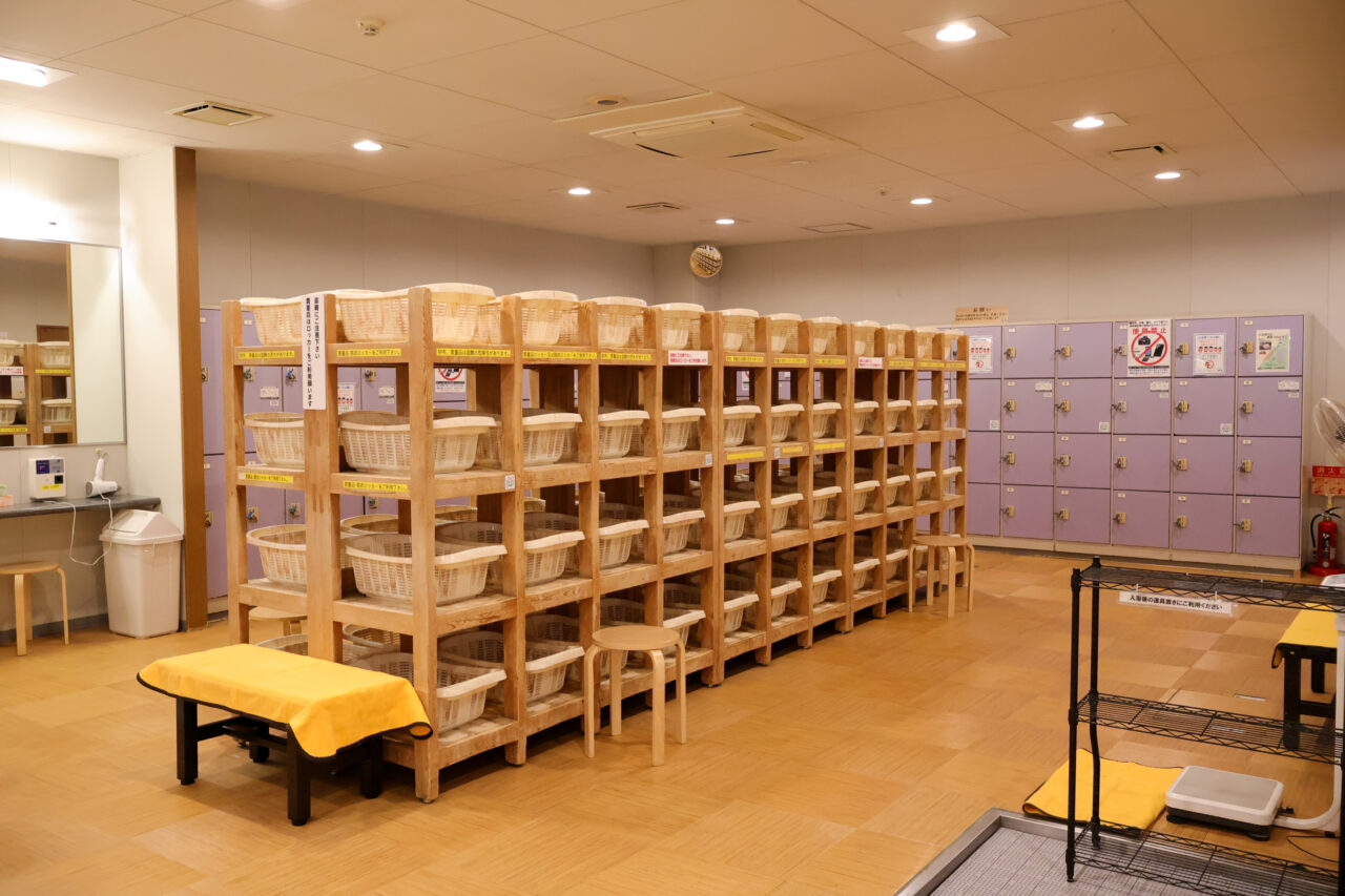 脱衣所はカゴと100円ロッカー(返金式)、1回10円のドライヤーや自販機を備え付け。