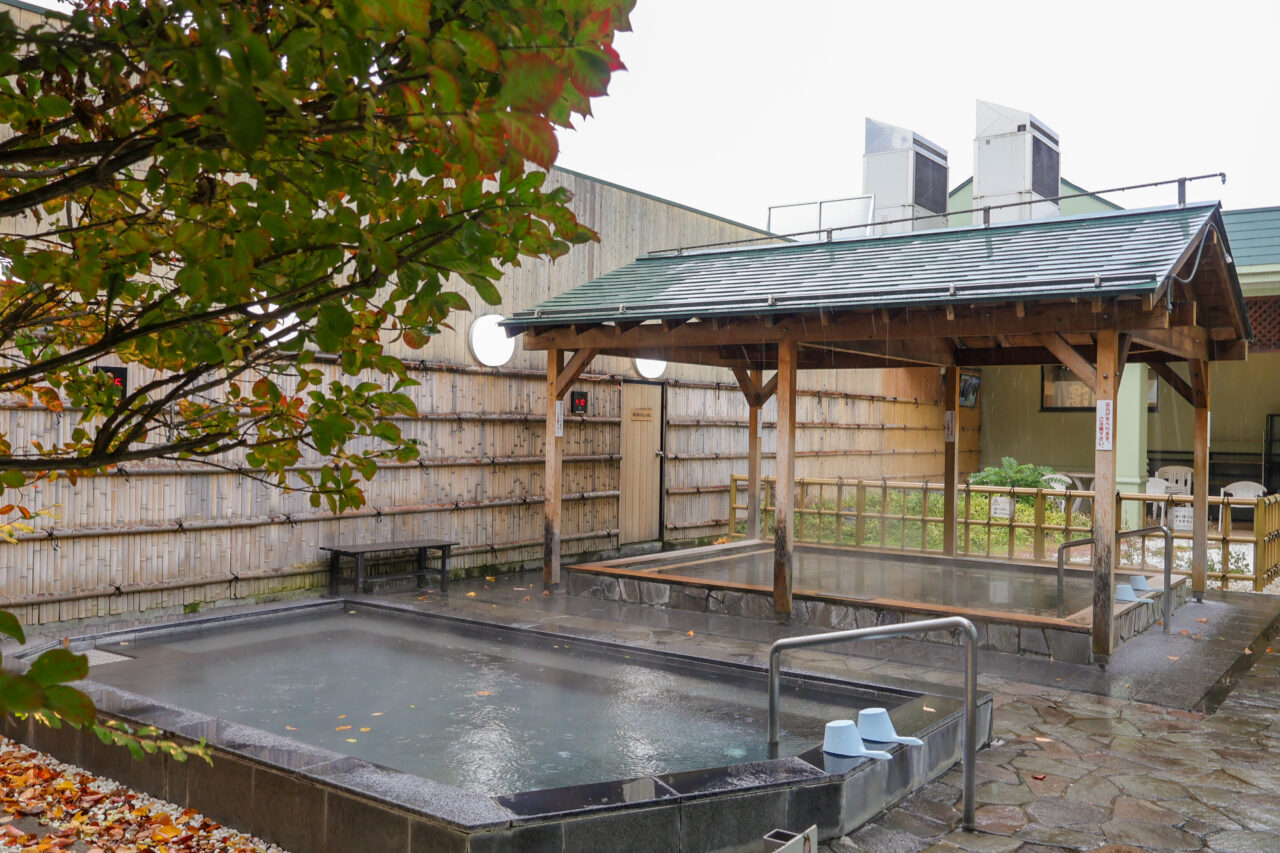 露天には2つの浴槽があり、石造りの浴槽とヒノキ風呂が選べます。