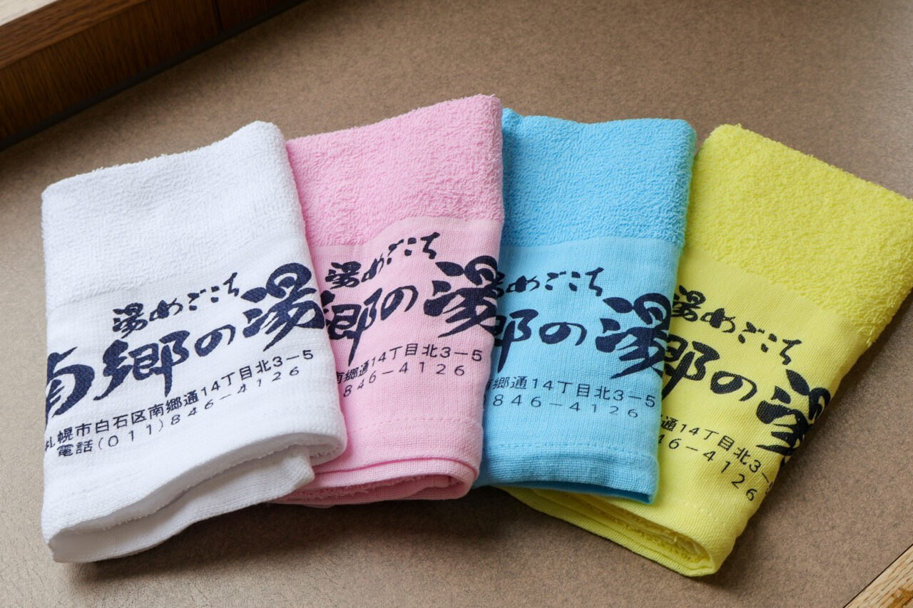 ポイントカード1枚(ハンコ30個分)と交換できるフェイスタオル220円は、南郷の湯のロゴ入り。