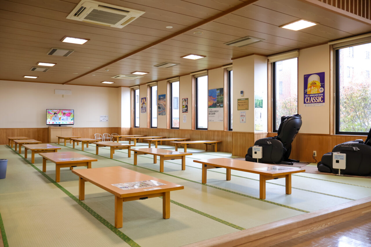 広々とした休憩スペースには、テーブル席と小上がりを用意。