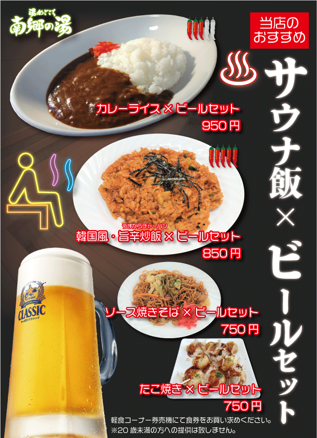 ちなみに、今人気なのが「サウナ飯×ビールセット」。カレーライス×ビール950円やソース焼きそば×ビール750円など、ビールと相性抜群のメニューをお得に味わってみては?