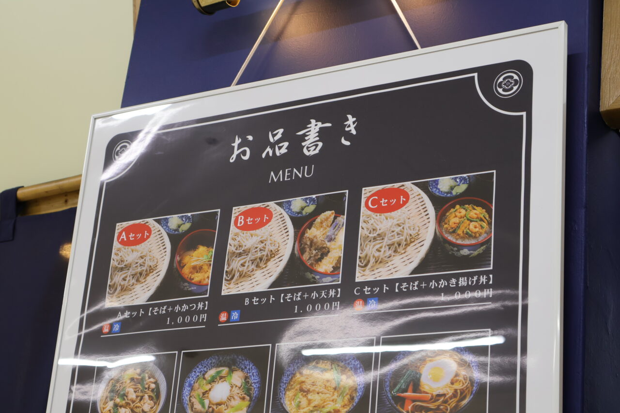 山田さんにおすすめを伺うと「温かいおそばと冷たいおそば、そして3種の小丼ぶりが選べる「A・B・Cセット(各1,000円)」ですね! これは本店にも無いメニューで、働く方も多く訪れると思いランチ限定で登場しました」とにっこり。